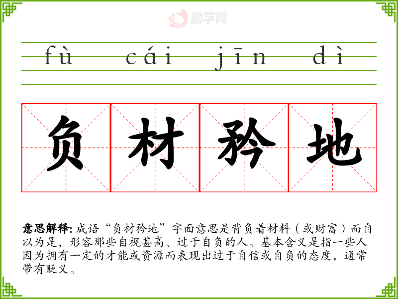 成语“负材矜地”字面意思是背负着材料(或财富)而自以为是,形容那些自视甚高、过于自负的人。基本含义是指一些人因为拥有一定的才能或资源而表现出过于自信或自负的态度,通常带有贬义。