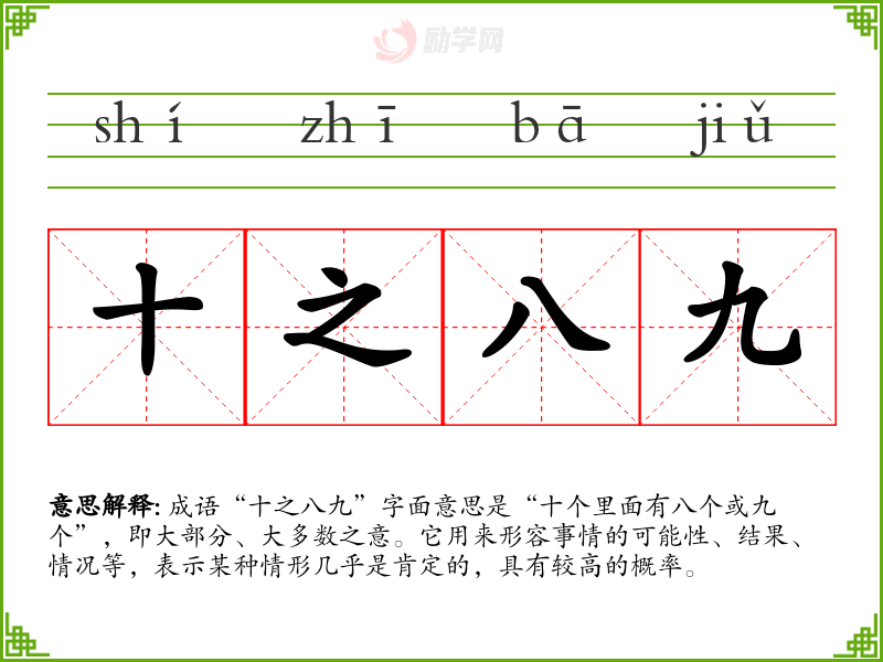成语“十之**”字面意思是“十个里面有八个或九个”,即大部分、大多数之意。它用来形容事情的可能性、结果、情况等,表示某种情形几乎是肯定的,具有较高的概率。