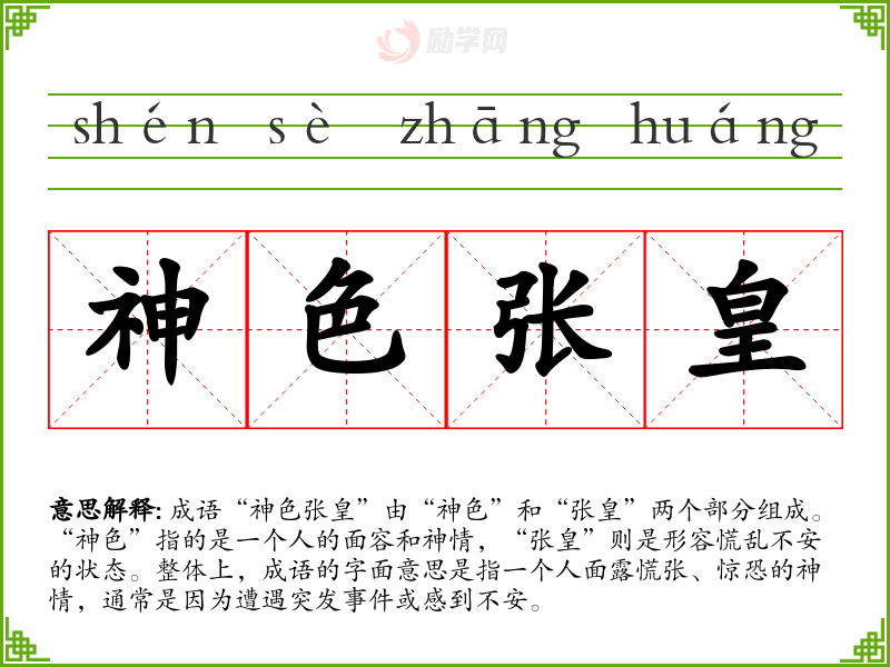 成语“神色张皇”由“神色”和“张皇”两个部分组成。“神色”指的是一个人的面容和神情,“张皇”则是形容慌乱不安的状态。整体上,成语的字面意思是指一个人面露慌张、惊恐的神情,通常是因为遭遇突发**或感到不安。