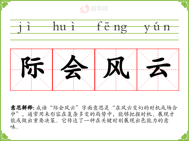 成语“际会风云”字面意思是“在风云变幻的时机或场合中”,通常用来形容在复杂多变的局势中,能够把握时机、展现才能或做出重要决策。它传达了一种在关键时刻展现出色能力的意味。
