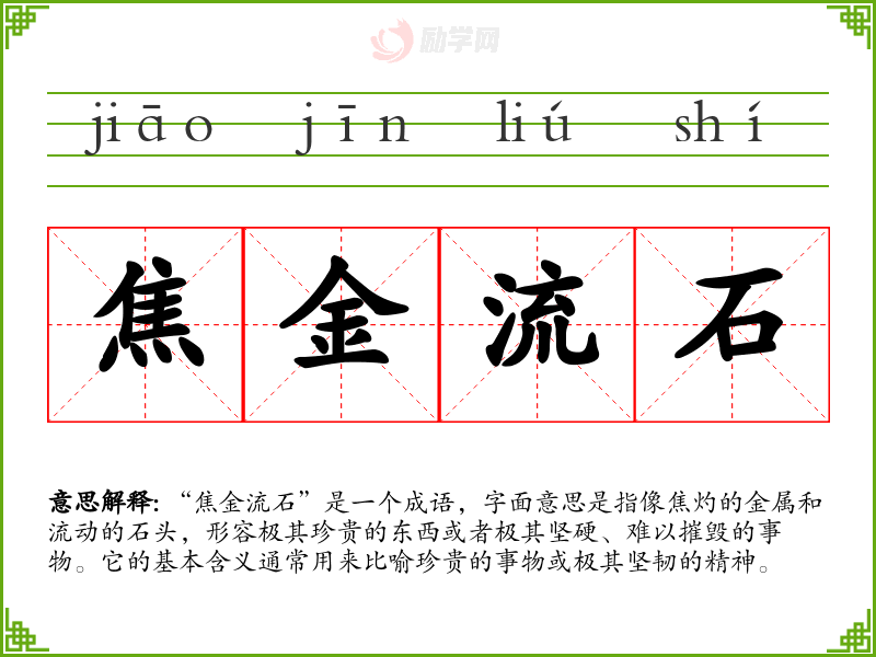 “焦金流石”这个成语在我心中激起了对坚韧不拔、追求卓越的情感。它让我联想到那些在逆境中依旧奋勇前行的人,以及那些值得珍惜的事物。