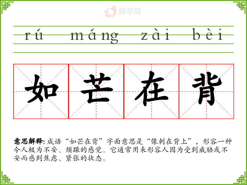 成语“如芒在背”字面意思是“像刺在背上”,形容一种令人极为不安、烦躁的感觉。它通常用来形容人因为受到威胁或不安而感到焦虑、紧张的状态。