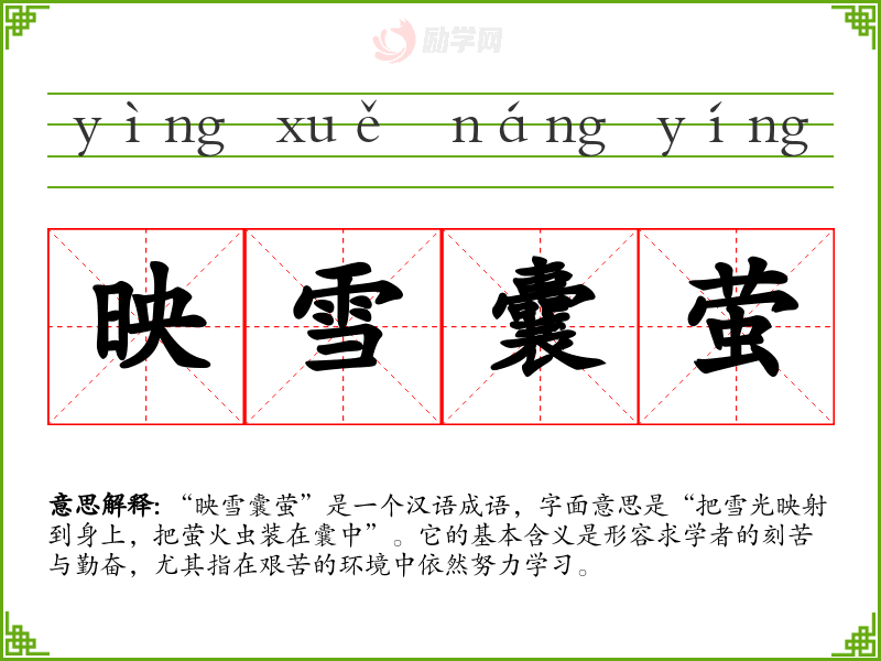 “映雪囊萤”是一个汉语成语,字面意思是“把雪光映射到身上,把萤火虫装在囊中”。它的基本含义是形容求学者的刻苦与勤奋,尤其指在艰苦的环境中依然努力学*。