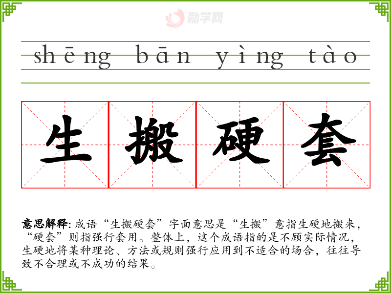 成语“生搬硬套”字面意思是“生搬”意指生硬地搬来,“硬套”则指强行套用。整体上,这个成语指的是不顾实际情况,生硬地将某种理论、方法或规则强行应用到不适合的场合,往往导致不合理或不成功的结果。