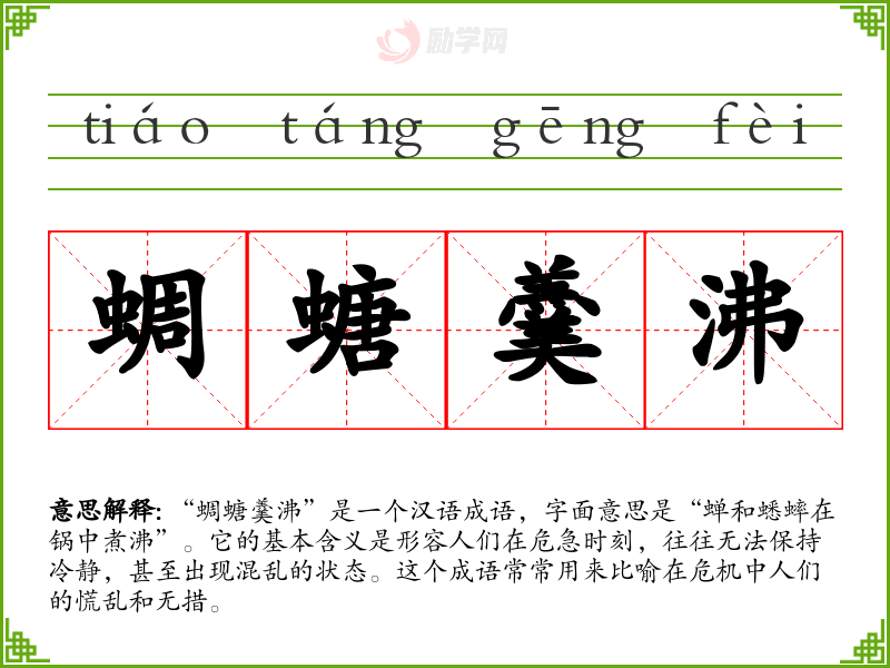 “蜩螗羹沸”是一个汉语成语,字面意思是“蝉和蟋蟀在锅中煮沸”。它的基本含义是形容人们在危急时刻,往往无法保持冷静,甚至出现混乱的状态。这个成语常常用来比喻在危机中人们的慌乱和无措。