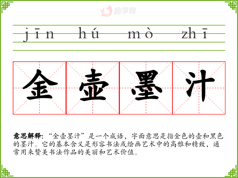 通过对“金壶墨汁”的学,我更加理解了书法艺术的重要性及其在文化传承中的角色。这不仅丰富了我的词汇,也提高了我在表达艺术欣赏时的准确性和深度。这个成语在我语言学中,帮助我更好地理解和表达对美的追求。
