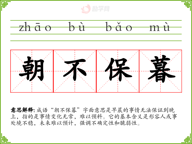 - 反义成语:如“安如泰山”,形容稳固可靠,完全相反于“朝不保暮”的意境。