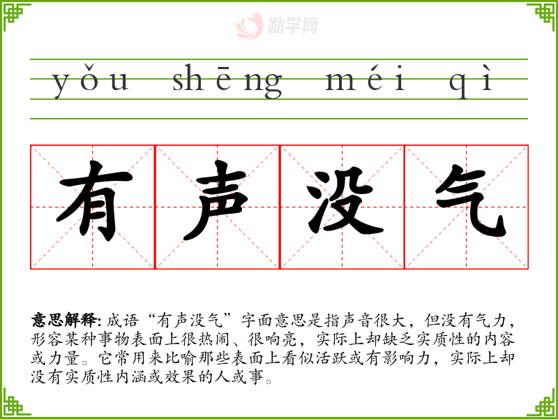 通过对成语“有声没气”的学习,我深刻认识到在交流和表达中,内容的实质性远比表面的形式更为重要。这种理解不仅丰富了我的语言表达能力,也让我在生活中更加关注事物的本质,避免被表象迷惑。