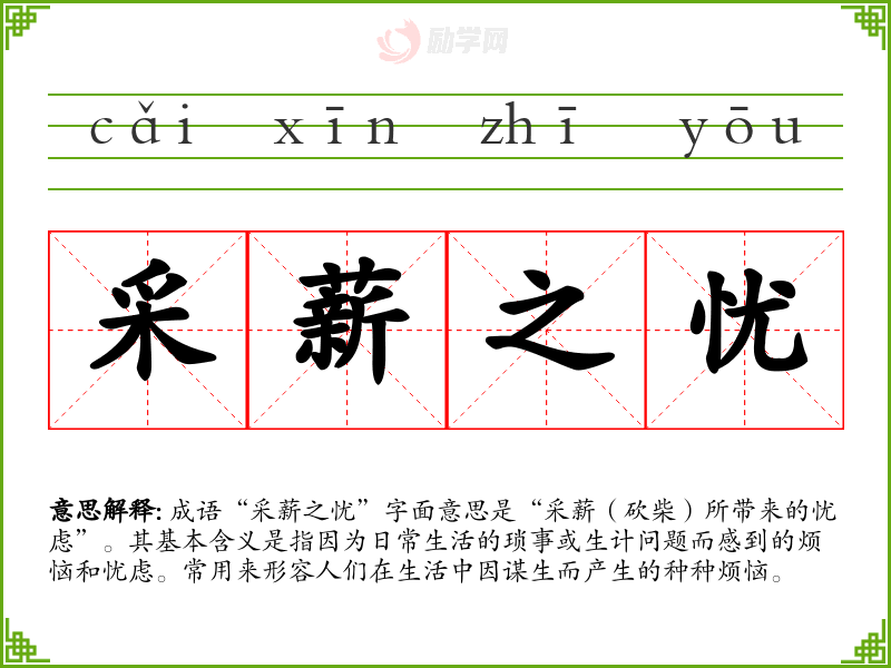 成语“采薪之忧”字面意思是“采薪(砍柴)所带来的忧虑”。其基本含义是指因为日常生活的琐事或生计问题而感到的烦恼和忧虑。常用来形容人们在生活中因谋生而产生的种种烦恼。
