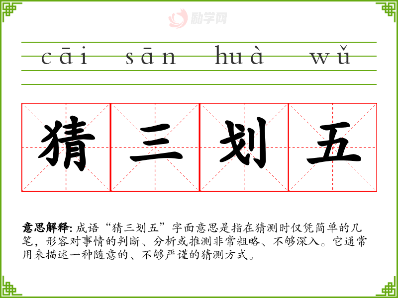 通过对“猜三划五”的学,我认识到在日常交流和讨论中,深思熟虑和严谨推理的重要性。这个成语提醒我们,在面对问题时,不应仅仅依赖表面的观察或随意的猜测,而应深入剖析,以求得更为准确的理解和结论。这对于我的语言学和表达能力提升具有重要意义。