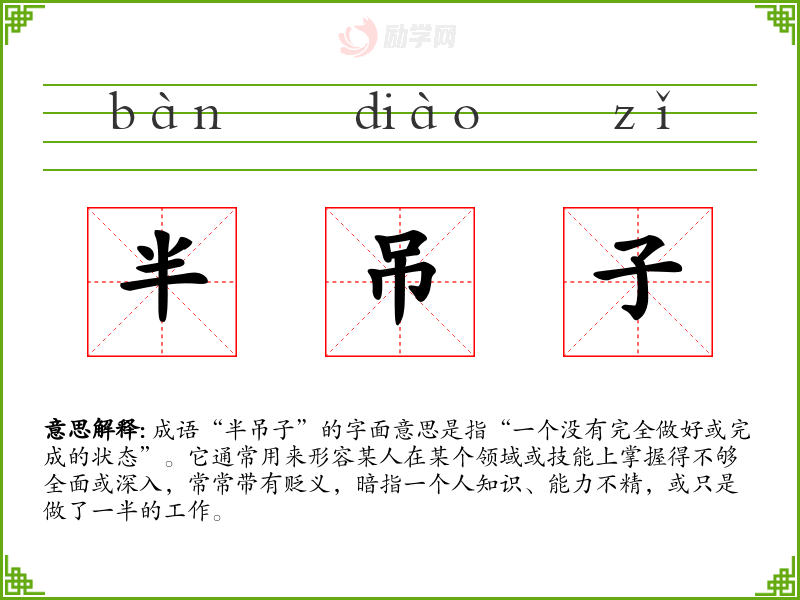 成语“半吊子”的字面意思是指“一个没有完全做好或完成的状态”。它通常用来形容某人在某个领域或技能上掌握得不够全面或深入,常常带有贬义,暗指一个人知识、能力不精,或只是做了一半的工作。