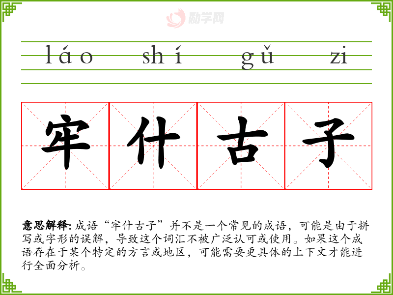 成语“牢什古子”并不是一个常见的成语,可能是由于拼写或字形的误解,导致这个词汇不被广泛认可或使用。如果这个成语存在于某个特定的方言或地区,可能需要更具体的上下文才能进行全面分析。