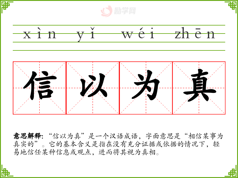 “信以为真”是一个汉语成语,字面意思是“相信某事为真实的”。它的基本含义是指在没有充分证据或依据的情况下,轻易地信任某种信息或观点,进而将其视为真相。