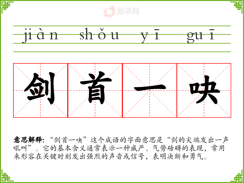 “剑首一吷”这个成语的字面意思是“剑的尖端发出一声吼叫”。它的基本含义通常表示一种威严、气势磅礴的表现,常用来形容在关键时刻发出强烈的声音或信号,表明决断和勇气。