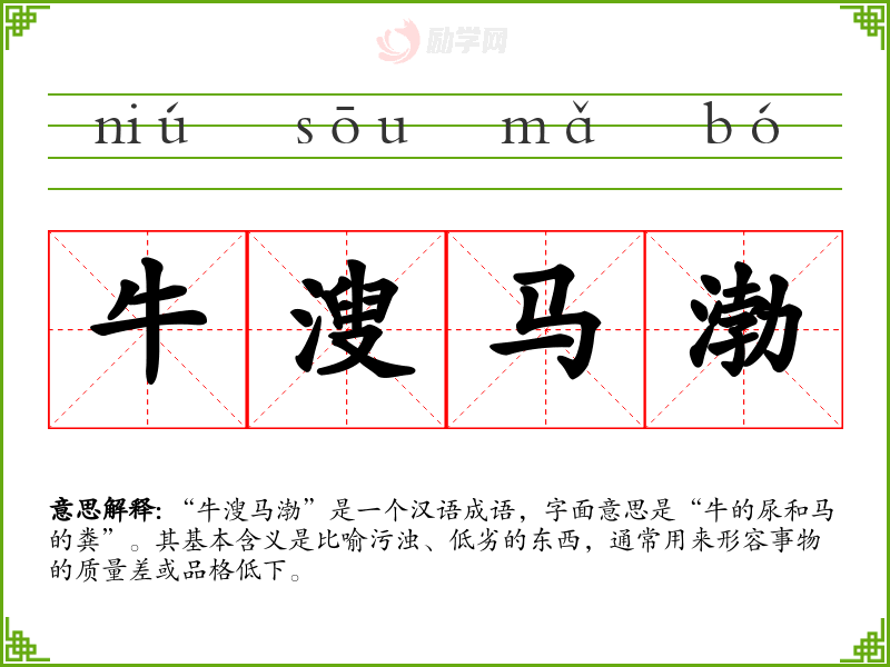 “牛溲马渤”是一个汉语成语,字面意思是“牛的尿和马的粪”。其基本含义是比喻污浊、低劣的东西,通常用来形容事物的质量差或品格低下。