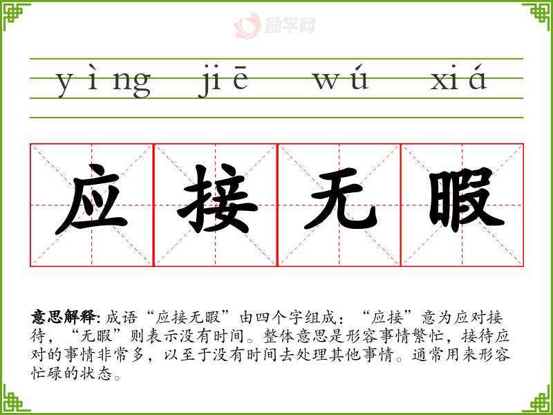 成语“应接无暇”由四个字组成:“应接”意为应对接待,“无暇”则表示没有时间。整体意思是形容事情繁忙,接待应对的事情非常多,以至于没有时间去处理其他事情。通常用来形容忙碌的状态。