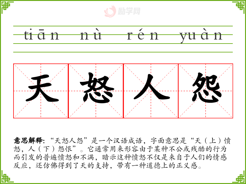 通过对“天怒人怨”的学,深刻体会到了语言的力量与社会背景的紧密联系。这个成语不仅在表达愤怒和不满时具有强烈的表现力,也在语言学中提醒我们关注社会公正与道德责任,丰富了我的表达方式和思维深度。