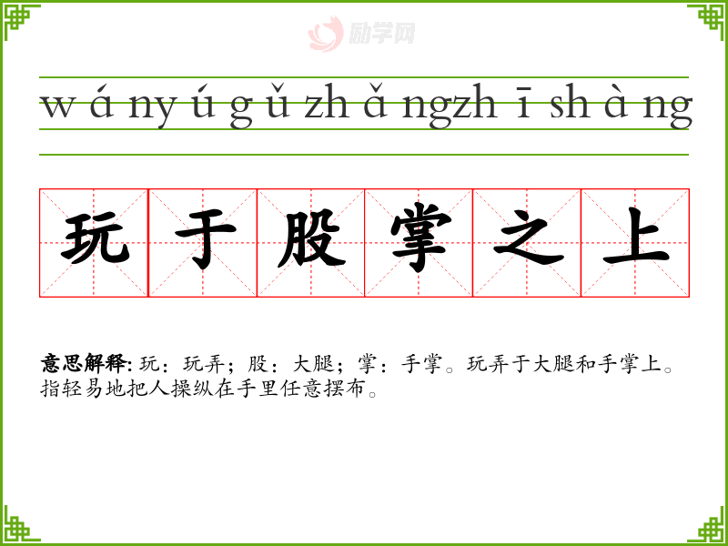 玩:玩弄;股:大腿;掌:手掌。玩弄于大腿和手掌上。指轻易地把人操纵在手里任意摆布。