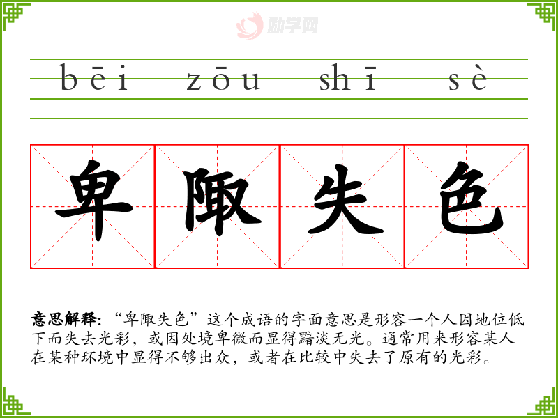 “卑陬失色”这个成语的字面意思是形容一个人因地位低下而失去光彩,或因处境卑微而显得黯淡无光。通常用来形容某人在某种环境中显得不够出众,或者在比较中失去了原有的光彩。