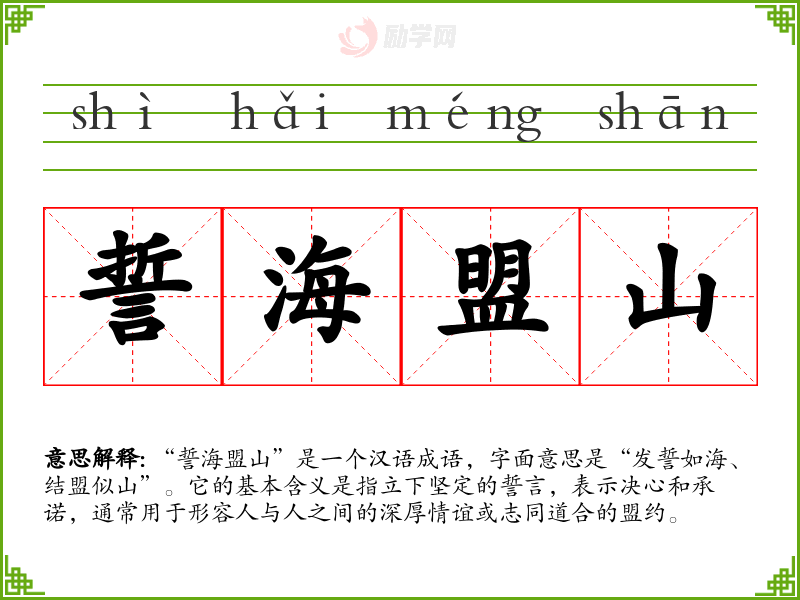 “誓海盟山”是一个汉语成语,字面意思是“发誓如海、结盟似山”。它的基本含义是指立下坚定的誓言,表示决心和承诺,通常用于形容人与人之间的深厚情谊或志同道合的盟约。