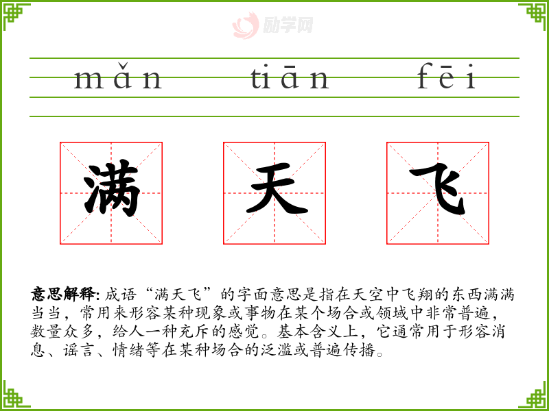 “满天飞”并没有明确的历史典故或文学出处,其构成由“满”和“天飞”两个部分组成,形象地表达了事物在空中飞舞,覆盖广泛的状态。这个成语的形成可能与古代对自然现象的观察有关,尤其是在形容某些事物的数量时,常使用“满天”来强调其普及程度。
