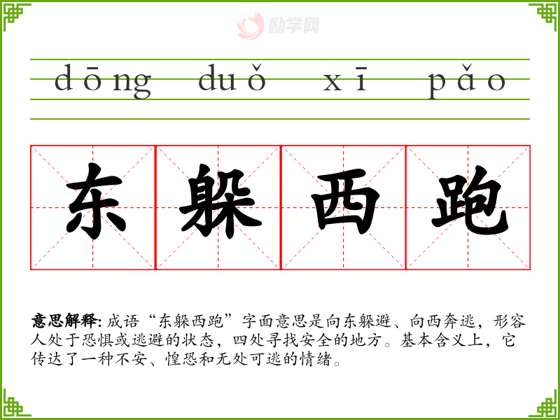 成语“东躲西跑”字面意思是向东躲避、向西奔逃,形容人处于恐惧或逃避的状态,四处寻找安全的地方。基本含义上,它传达了一种不安、惶恐和无处可逃的情绪。