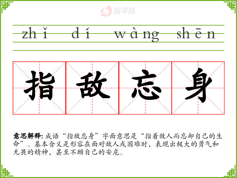 成语“指敌忘身”字面意思是“指着敌人而忘却自己的生命”。基本含义是形容在面对敌人或困难时,表现出极大的勇气和无畏的精神,甚至不顾自己的安危。