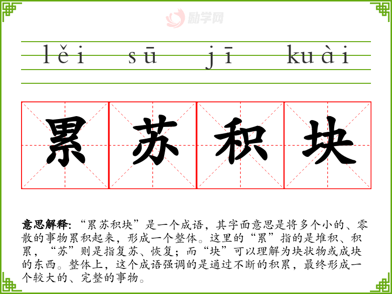 “累苏积块”并不是一个广为人知的成语,可能在文献中较少见。不过,从字面拆解来看,它可以与“积少成多”或“积沙成塔”这类成语产生关联,这些成语都表达了通过持续的努力和积累,最终可以达到某种目标的思想。
