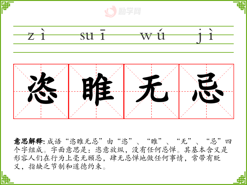 成语“恣睢无忌”由“恣”、“睢”、“无”、“忌”四个字组成。字面意思是:恣意放纵,没有任何忌惮。其基本含义是形容人们在行为上毫无顾忌,肆无忌惮地做任何事情,常带有贬义,指缺乏节制和道德约束。