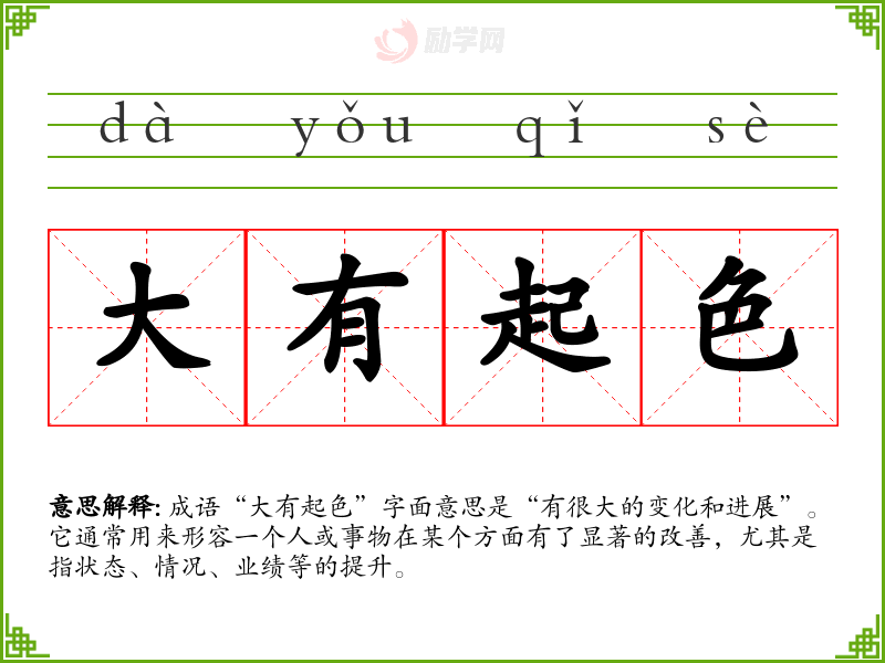 成语“大有起色”字面意思是“有很大的变化和进展”。它通常用来形容一个人或事物在某个方面有了显著的改善,尤其是指状态、情况、业绩等的提升。
