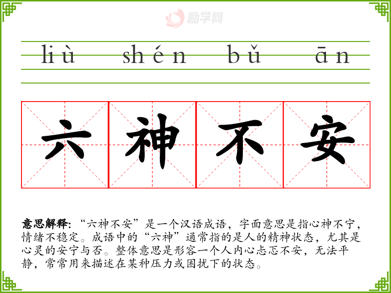 “六神不安”是一个汉语成语,字面意思是指心神不宁,情绪不稳定。成语中的“六神”通常指的是人的精神状态,尤其是心灵的安宁与否。整体意思是形容一个人内心忐忑不安,无法平静,常常用来描述在某种压力或困扰下的状态。