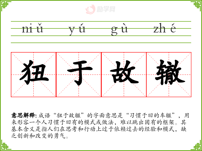 - 同义成语:因循守旧、墨守成规。这些成语都表达了对旧有模式的依赖和不愿意改变的态度。
