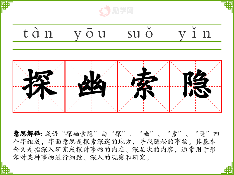 成语“探幽索隐”由“探”、“幽”、“索”、“隐”四个字组成,字面意思是探索深邃的地方,寻找隐秘的事物。其基本含义是指深入研究或探讨事物的内在、深层次的内容,通常用于形容对某种事物进行细致、深入的观察和研究。