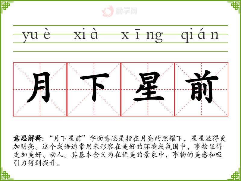 “月下星前”字面意思是指在月亮的照耀下,星星显得更加明亮。这个成语通常用来形容在美好的环境或氛围中,事物显得更加美好、动人。其基本含义为在优美的景象中,事物的美感和吸引力得到提升。