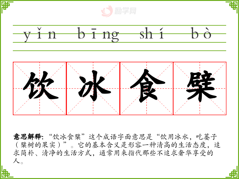 “饮冰食檗”这个成语字面意思是“饮用冰水,吃蒌子(檗树的果实)”。它的基本含义是形容一种清高的生活态度,追求简朴、清净的生活方式,通常用来指代那些不追求奢华享受的人。