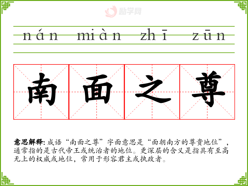 通过对“南面之尊”的分析,我认识到它不仅是一个历史成语,更是对权力与责任深刻的思考。在语言学*中,掌握这样的成语有助于丰富表达,提高理解能力,同时也提醒我们在追求权力的同时,不能忽视道德与责任的重要性。