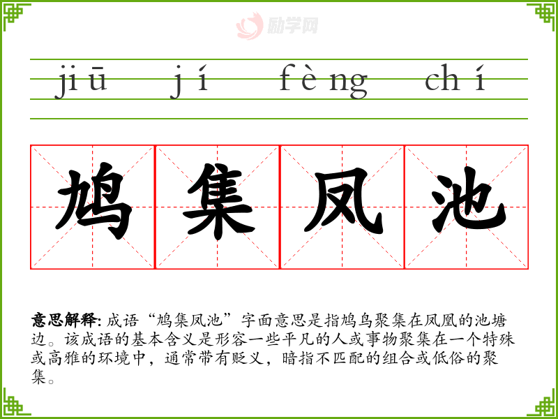 成语“鸠集凤池”字面意思是指鸠鸟聚集在凤凰的池塘边。该成语的基本含义是形容一些平凡的人或事物聚集在一个特殊或高雅的环境中,通常带有贬义,暗指不匹配的组合或低俗的聚集。