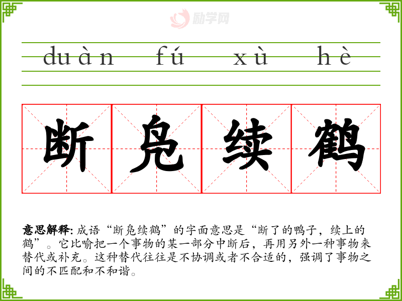 - 反义成语:天衣无缝、和谐美满。这些成语传达的是事物之间的和谐与完美,正好与“断凫续鹤”形成对比。