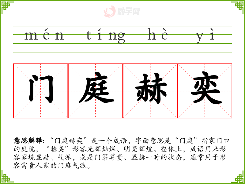 “门庭赫奕”是一个成语,字面意思是“门庭”指家门口的庭院,“赫奕”形容光辉灿烂、明亮辉煌。整体上,成语用来形容家境显赫、气派,或是门第尊贵、显赫一时的状态,通常用于形容富贵人家的门庭气派。
