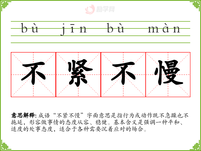 成语“不紧不慢”字面意思是指行为或动作既不急躁也不拖延,形容做事情的态度从容、稳健。基本含义是强调一种平和、适度的处事态度,适合于各种需要沉着应对的场合。