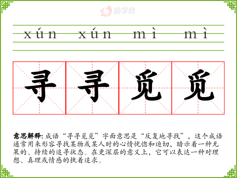 成语“寻寻觅觅”字面意思是“反复地寻找”,这个成语通常用来形容寻找某物或某人时的心情恍惚和迫切,暗示着一种无果的、持续的追寻状态。在更深层的意义上,它可以表达一种对理想、真理或情感的执着追求。