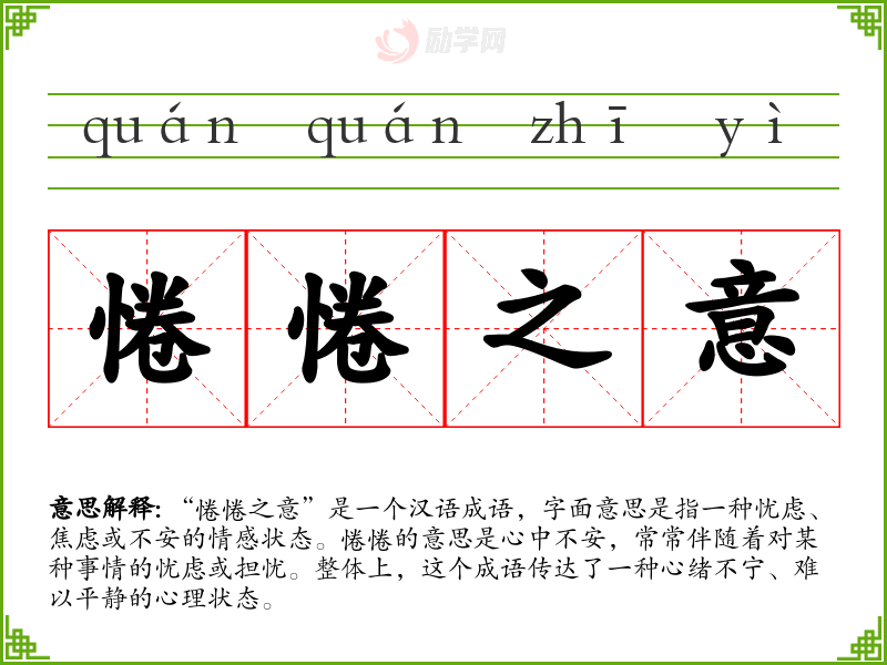 “惓惓之意”是一个汉语成语,字面意思是指一种忧虑、焦虑或不安的情感状态。惓惓的意思是心中不安,常常伴随着对某种事情的忧虑或担忧。整体上,这个成语传达了一种心绪不宁、难以平静的心理状态。