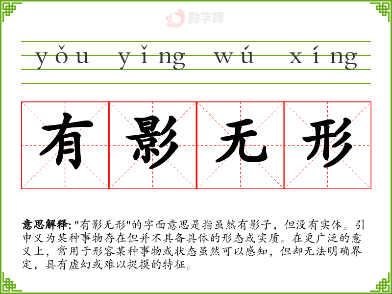 通过对“有影无形”的深入分析,我认识到这个成语不仅丰富了我的语言表达,更让我对抽象事物有了更深的理解。在日常交流中,适当使用这样的成语可以增强表达的层次感和情感深度,使沟通更加生动和有趣。