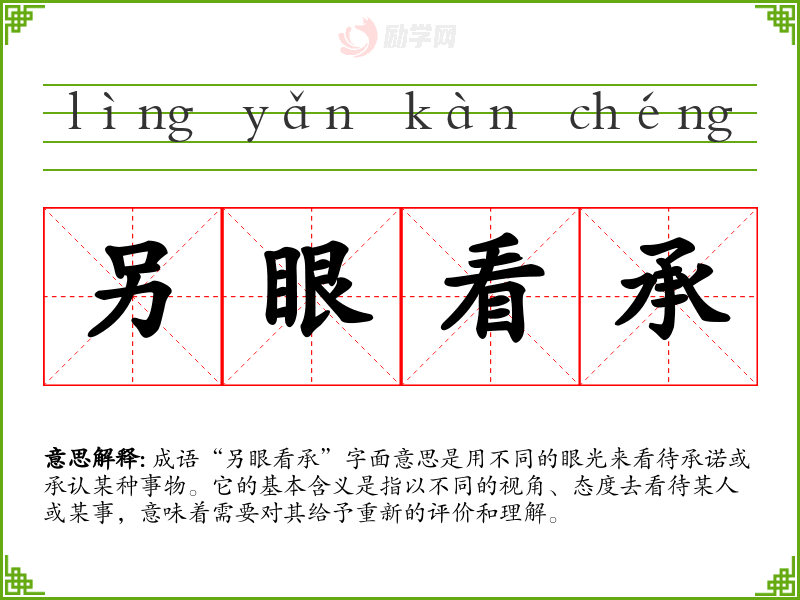 成语“另眼看承”字面意思是用不同的眼光来看待承诺或承认某种事物。它的基本含义是指以不同的视角、态度去看待某人或某事,意味着需要对其给予重新的评价和理解。