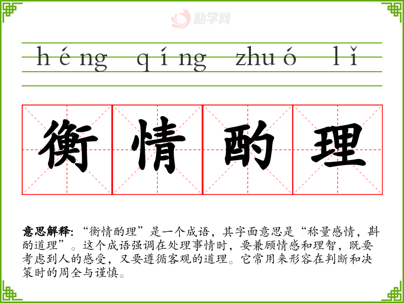 - 日常对话:在朋友之间讨论如何处理人际关系时,可以用“衡情酌理”来表达要兼顾感受和道理。