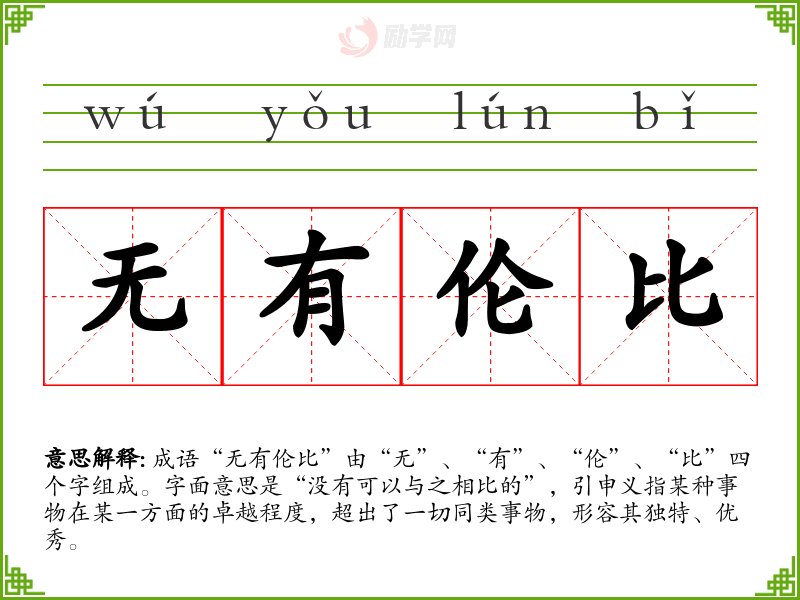 成语“无有伦比”由“无”、“有”、“伦”、“比”四个字组成。字面意思是“没有可以与之相比的”,引申义指某种事物在某一方面的卓越程度,超出了一切同类事物,形容其独特、优秀。