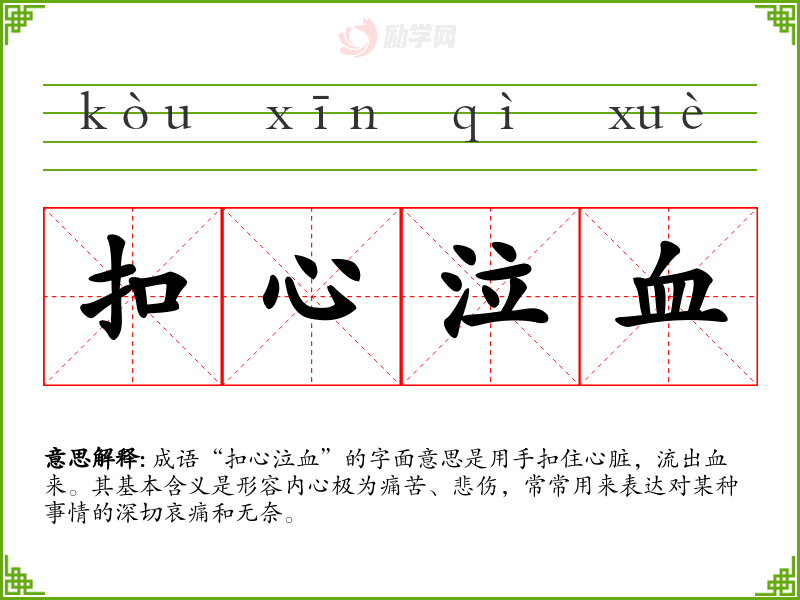 通过对“扣心泣血”的学,我更加理解了情感表达的重要性。在语言学中,掌握成语不仅能丰富表达,还能深入理解文化背景,增强沟通的深度和情感的传达。在实际应用中,我会努力将这样的成语融入到更丰富的语言表达中。