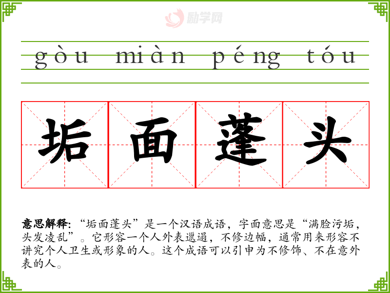“垢面蓬头”是一个汉语成语,字面意思是“满脸污垢,头发凌乱”。它形容一个人外表邋遢,不修边幅,通常用来形容不讲究个人卫生或形象的人。这个成语可以引申为不修饰、不在意外表的人。