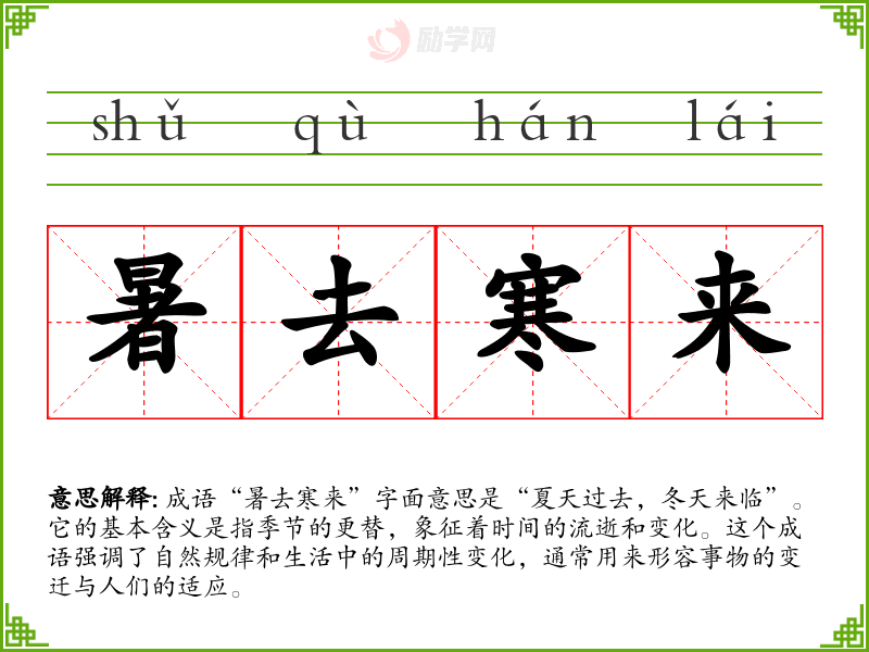 - “一成不变”:指事物没有变化,与“暑去寒来”所表达的变化相反。