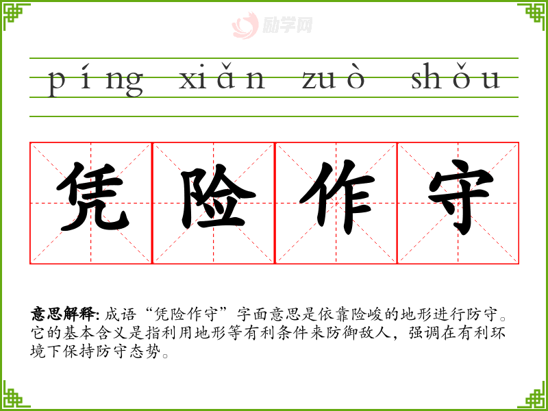 成语“凭险作守”字面意思是依靠险峻的地形进行防守。它的基本含义是指利用地形等有利条件来防御敌人,强调在有利环境下保持防守态势。